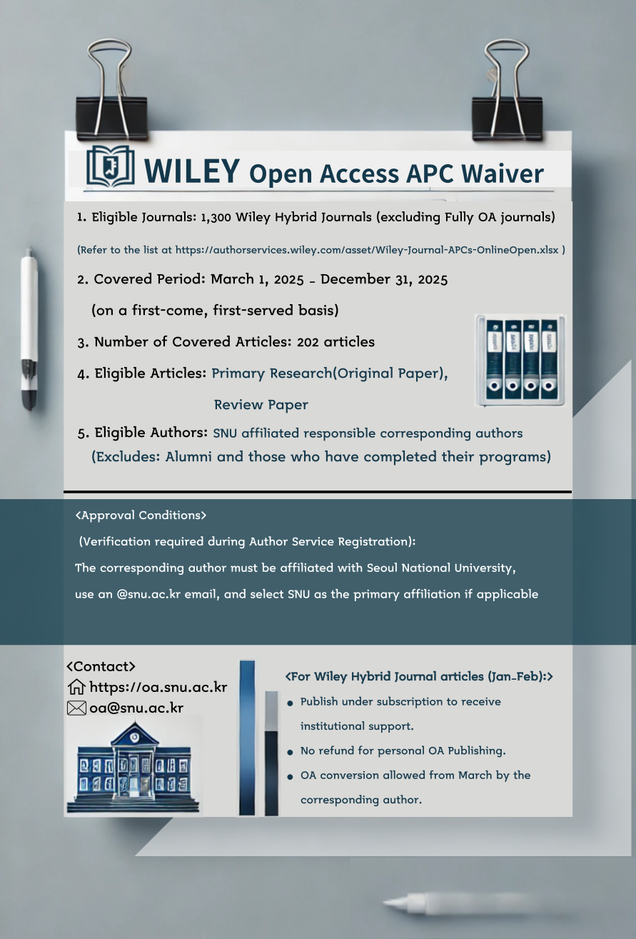 2. 2025년 우리 도서관은 KERIS 컨소시엄을 통해 Wiley 출판사와 OA 출판 계약을 체결하였으며 서울대 소속 책임교신저자들은 Wiley 하이브리드 저널에 '계약 논문 수' 내에서 OA 출판 비용을 면제 받을 수 있습니다.
