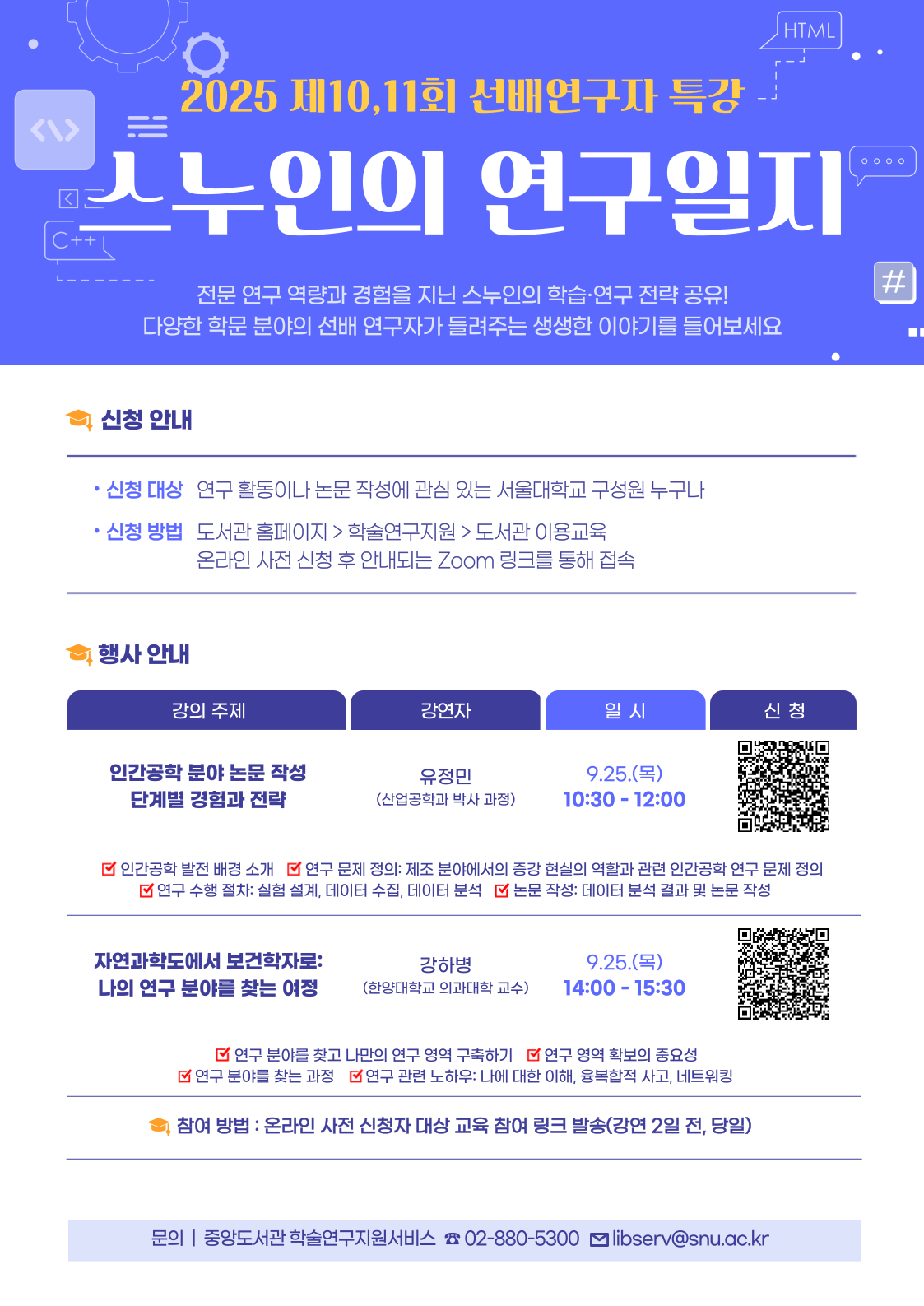 중앙도서관에서는 학문 분야별 선배 연구자들의 논문작성에 대한 경험을 후배 연구자들과 공유할 수 있는 기회를 제공하기 위해 선배 연구자 특강 「스누인의 연구일지」를 운영하고 있습니다.