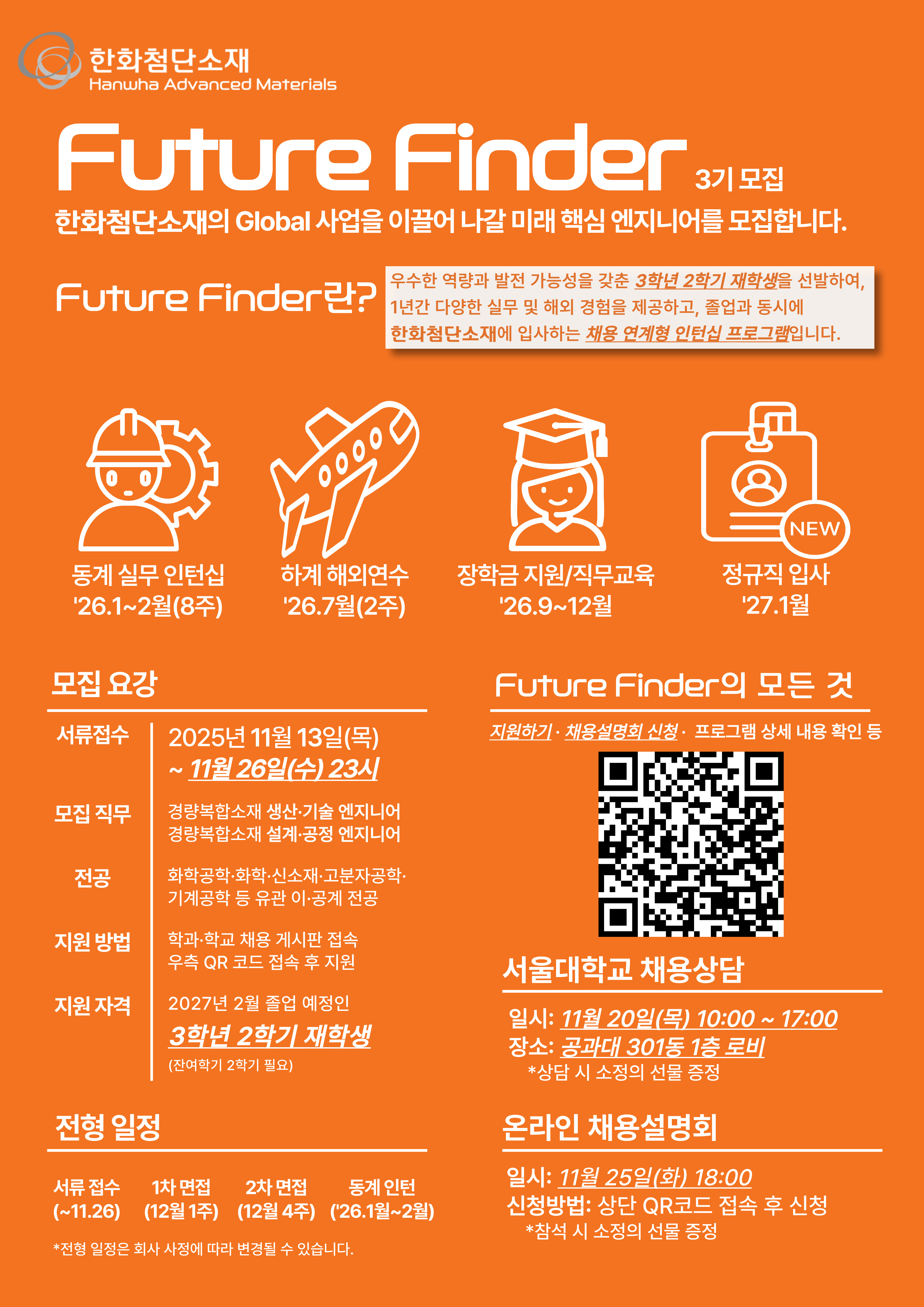 ‘Future Finder’는 현재 3학년 2학기 재학중인 화학생물공학/재료공학/기계공학 학부생 대상으로 하는