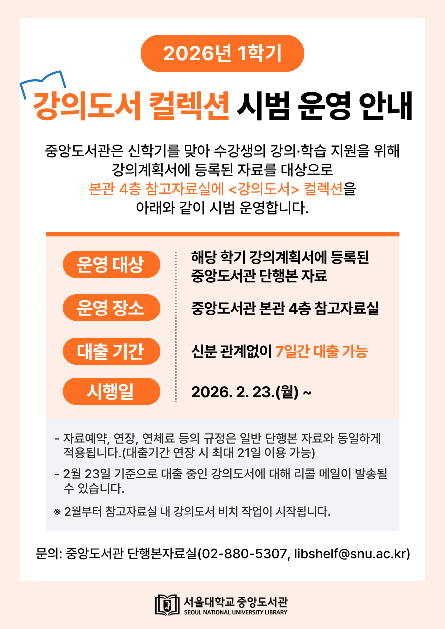 중앙도서관은 신학기를 맞아 수강생의 강의·학습 지원을 위해 아래와 같이 2026년 1학기 강의도서 컬렉션을 시범 운영하오니, 구성원에게 많은 관심 바랍니다.