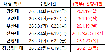 1. [강원대], [고려대], [부산대], [전북대], [한양대], [경남정보대] 2026학년도 1학기 교류 수학 안내문 및 추천 명단 양식 등.