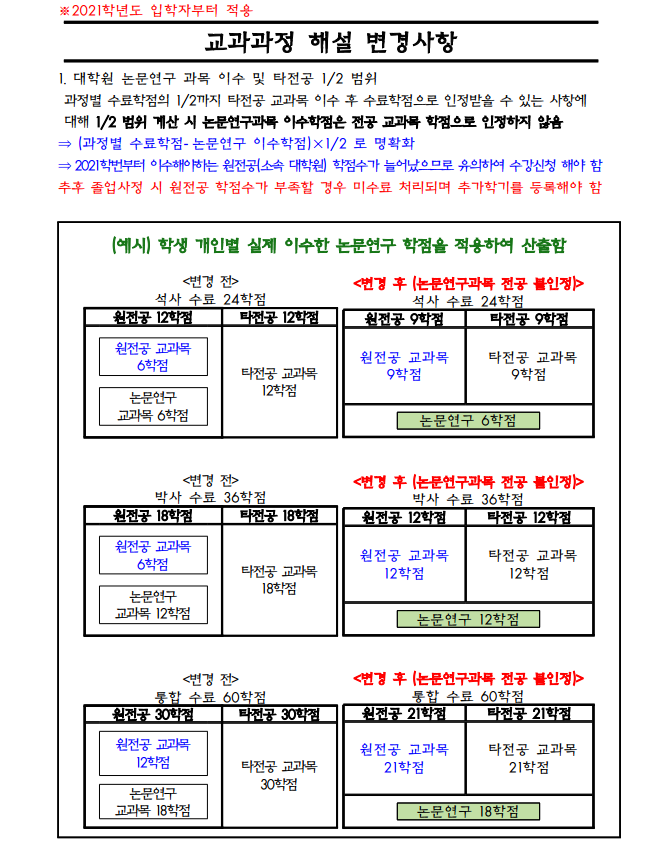 ※ 2021학년도 입학자부터, 소속 대학원 교과목 학점에 대학원 논문연구 미포함