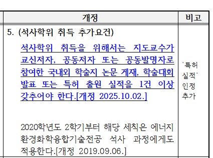 석사학위 취득을 위한 요건에 특허 출원 실적을 추가로 인정하기로 하여 공고합니다.